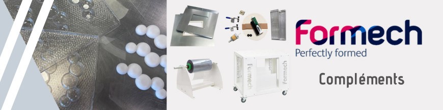 Retrouvez l'ensemble des compléments et des pièces détachées pour les thermoformeuses Formech. Vous trouverez des cadres de réduction, des kits de pièces détachées, des compléments comme un chariot ou des portes bobines. Si vous n'arrivez pas à trouver la pièce qu'il vous faut, alors n'hésitez pas à nous consulter.