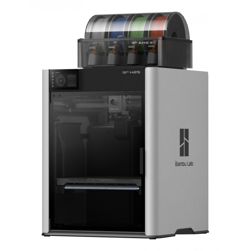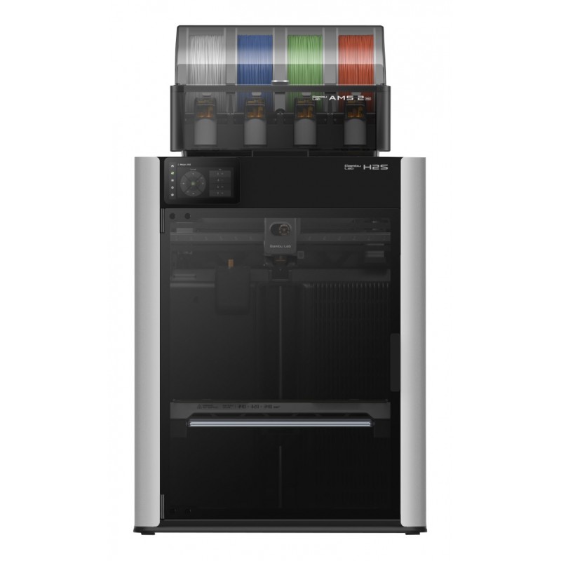 Impression Multicolore : La machine H2S Combo intègre le nouveau AMS 2 Pro (Automatic Material System) qui permet d'imprimer en couleur. Il est très fiable et simple d'utilisation. Il peut être couplé à d'autres AMS pour offrir la possibilité d'imprimer jusqu'à 24 couleurs (16 couleurs avec 4 AMS 2 Pro et 8 couleurs supplémentaires avec 8 AMS HT).