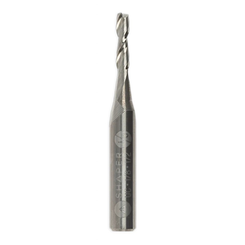 Fraise 1/8" en carbure monobloc, idéale pour les détails fins et les fraisages complexes. Queue 1/4" compatible avec la pince adaptée.