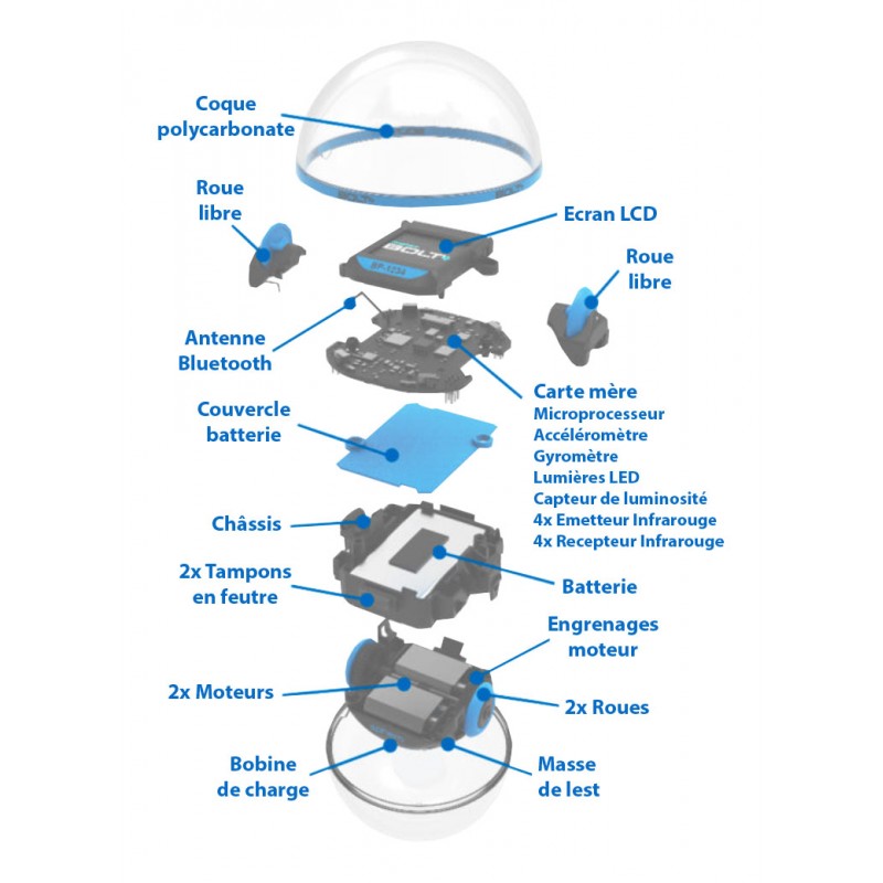 Cette nouvelle version du Sphero Bolt intègre un écran LCD programmable, des LEDs programmable et de nombreuses fonctionnalités de programmation.