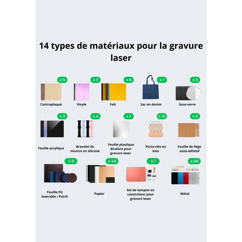 Kit complet de 159 pièces avec 28 matériaux variés (bois, acrylique, métal, vinyle, etc.) pour tester, créer et personnaliser facilement avec une machine de gravure et découpe laser.